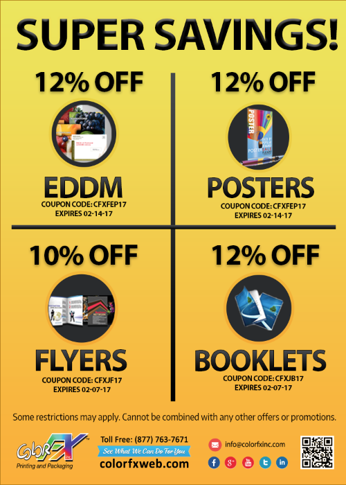 Save 12% off on EDDM & Posters. Coupon Code: CFXFEP17. Expires 02-14-17.