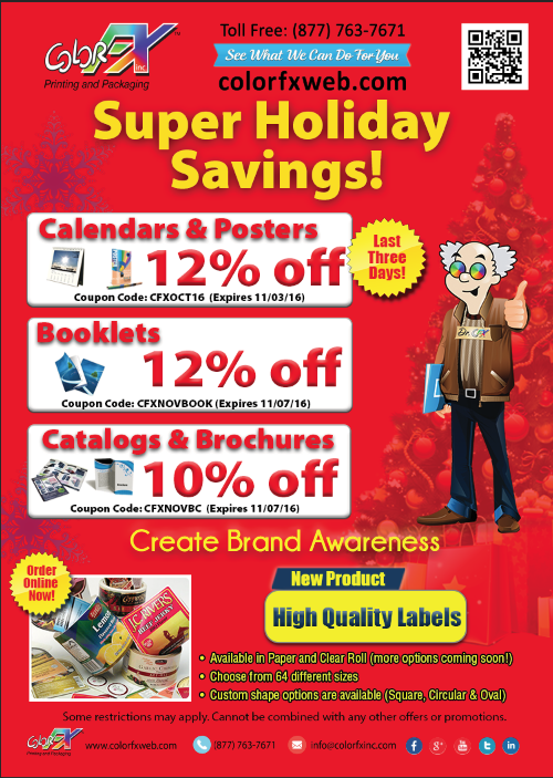 Super Holiday Savings from Colorfxweb.com Calendars & Posters 12% off Coupon Code: CFXOCT16 (Expires 11/03/16) Booklets 12% off Coupon Code: CFXNOVBOOK (Expires 11/07/16) Catalogs & Brochures 10% off Coupon Code: CFXNOVBC (Expires 11/07/16).